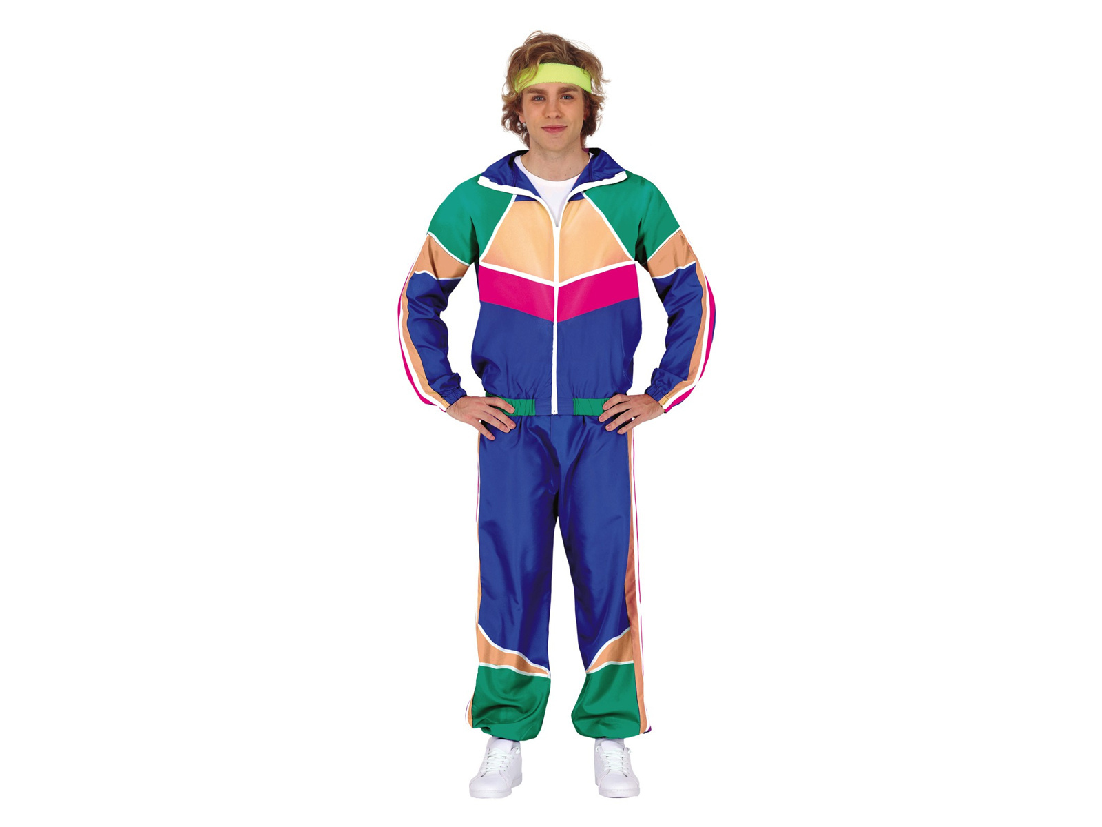 • 80-as évekbeli kék tréningruha zöld, narancssárga és rózsaszín csíkokkal.