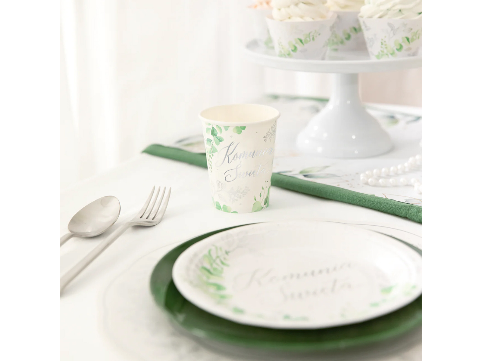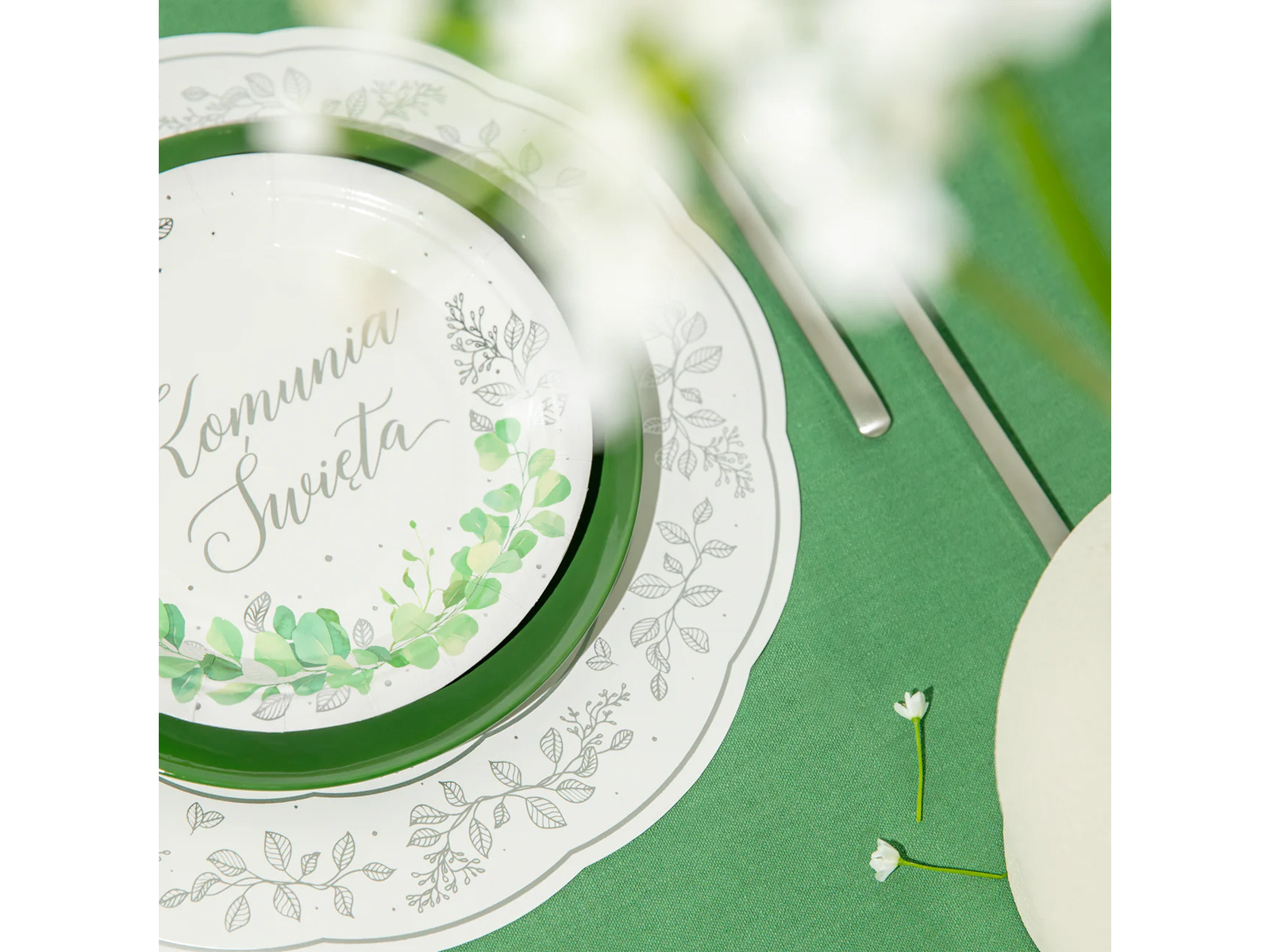 • Papírtányérok levélnyomtatással és ezüst áldozási felirattal.