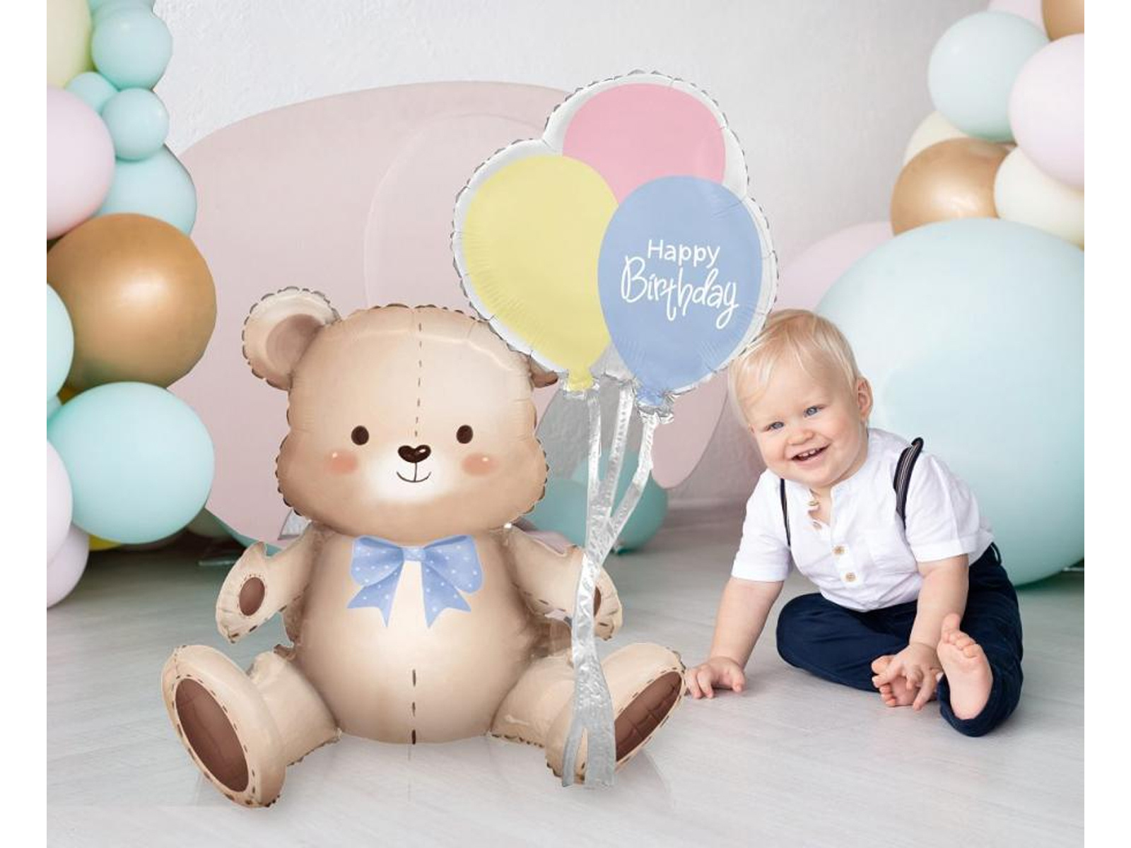 Álló fóliából készült Teddy mackó lufi boldog születésnapot lufikkal - 41 x 76 x 31 cm - 1 db.