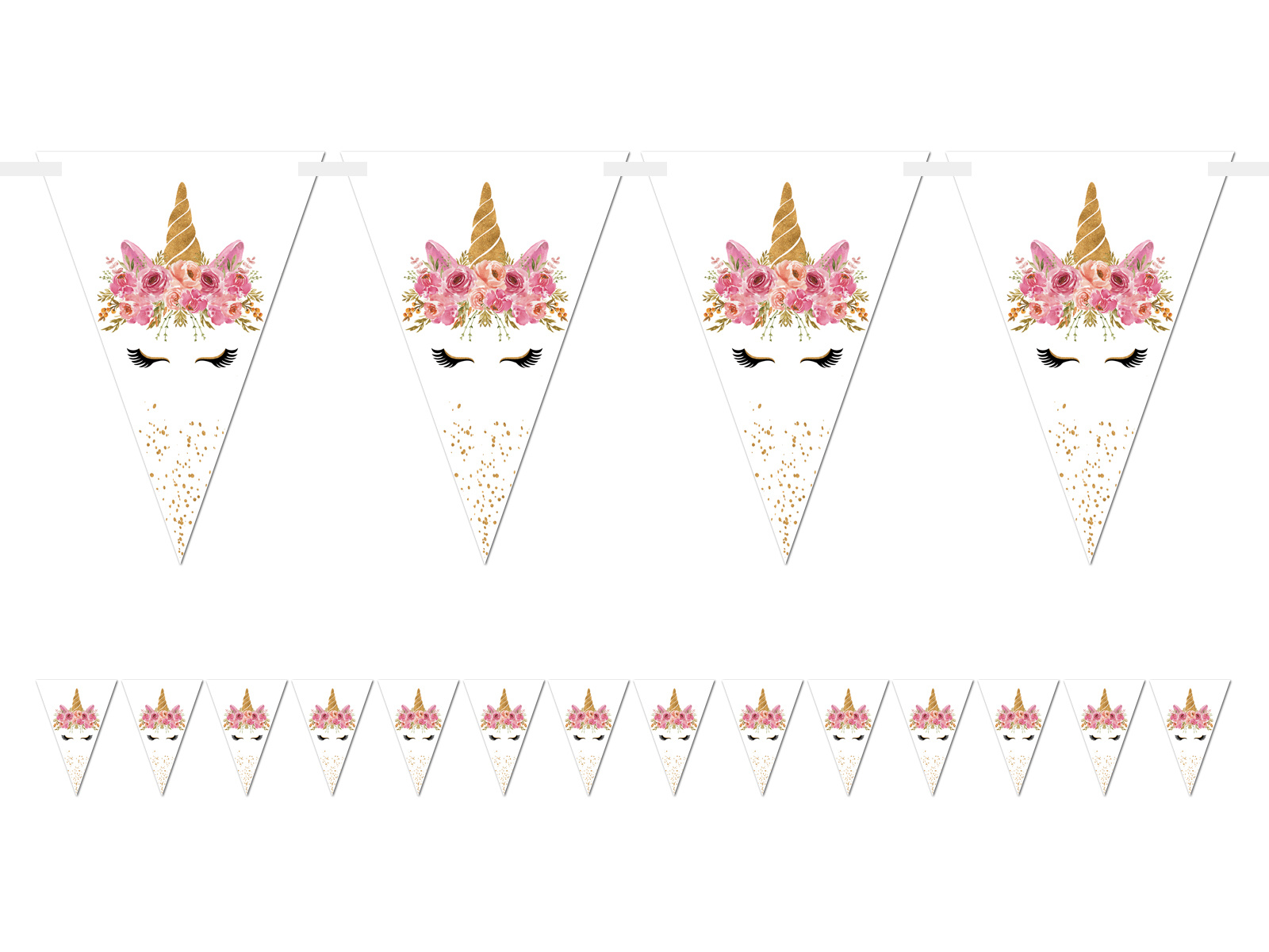 Világítsd meg a partit varázslattal és színekkel a mi "Egyszarvú zászlós banner - 5 m". Ez az egyedi, egyszarvú fejmotívummal és virágfüzérrel díszített füzér bájos hangulatot kölcsönöz bármelyik szobának. Tökéletes születésnapokra, babaköszöntőkre és akár szobadíszítésre is.