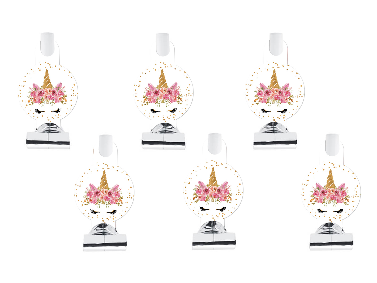 Érezze a varázslatot minden partin az egyedi egyszarvú motívumú trombitasípokkal! Mindegyik síp színes nyomtatással van díszítve, amely egy virágfüzérrel körülvett egyszarvú fejet ábrázol, egyedülálló bájt kölcsönözve az ünnepségeknek.