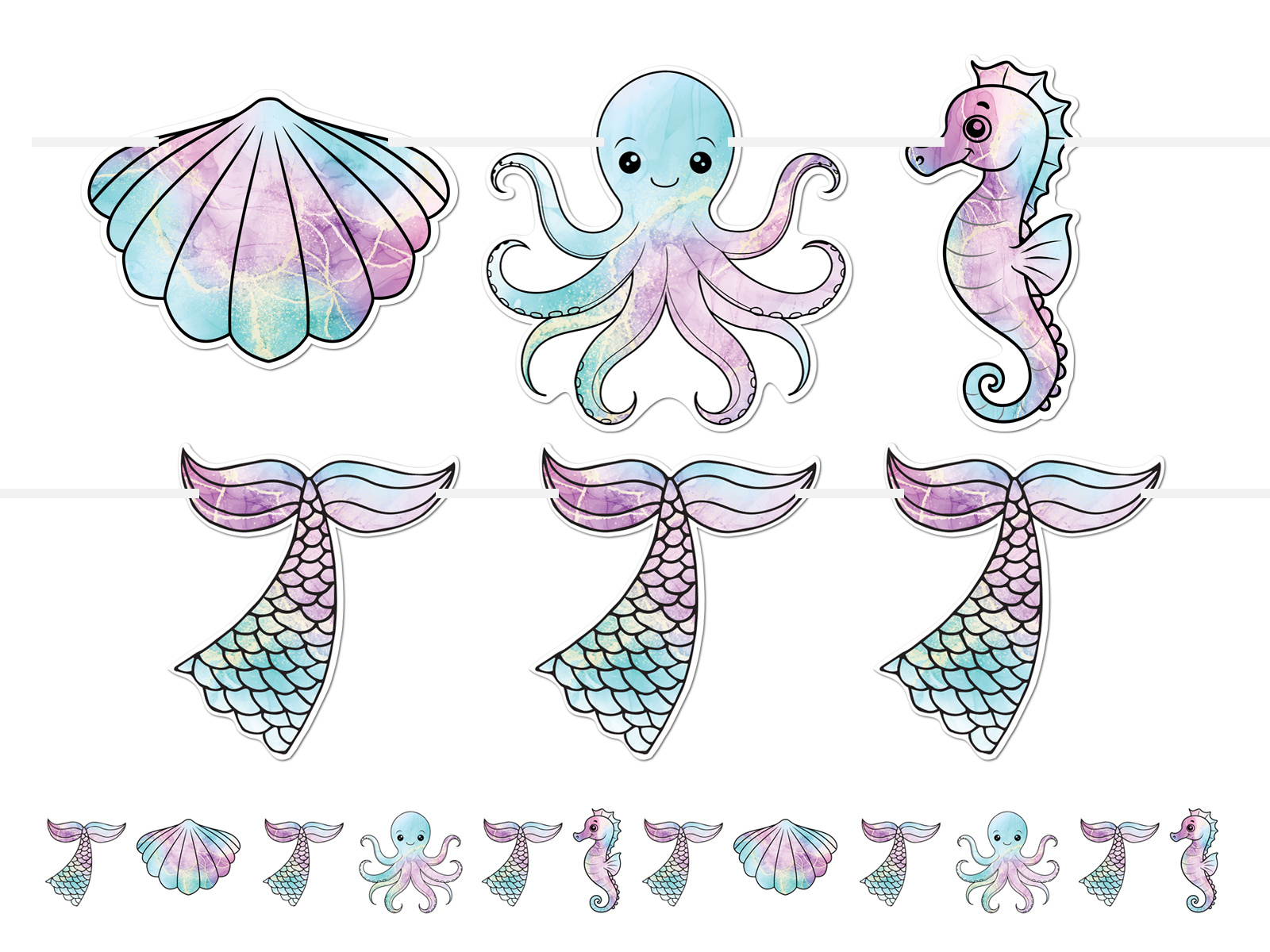 Utazzon el a tenger mélyére a mi Sellő füzérrel. Ez a kiváló minőségű papírból készült dekoratív füzér színes víz alatti lényeket ábrázoló medálokkal díszített. Mindegyik készlet 12 gondosan megmunkált, 8 és 12 cm közötti méretű darabot tartalmaz, amelyek lenyűgöző tengeri karaktereket ábrázolnak.