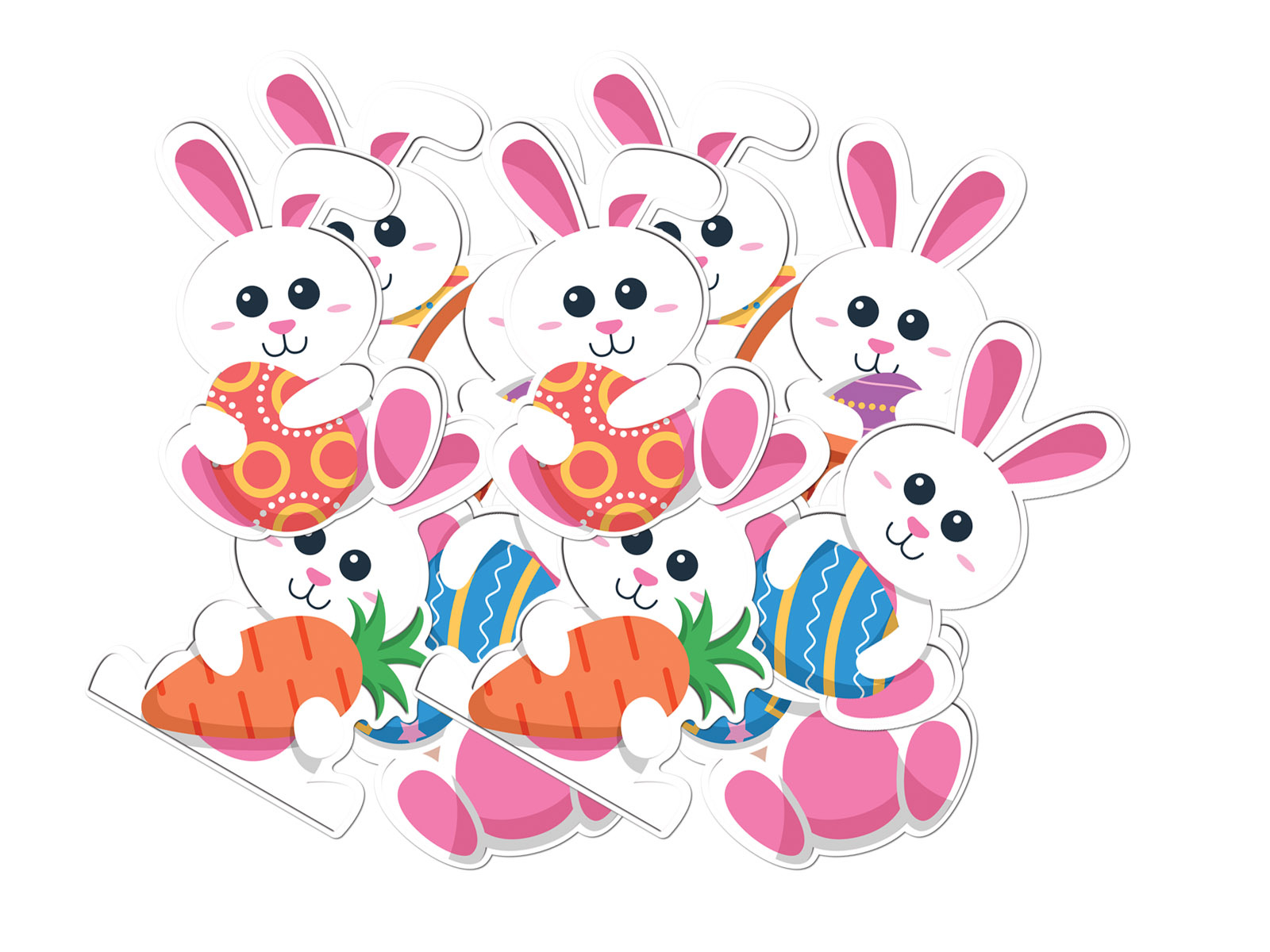 • Kétoldalas papír dekorációk húsvéti nyuszikkal.