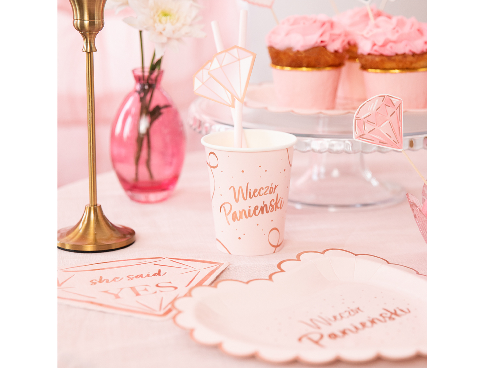 • Rózsaszín papírpoharak aranyozott betűkkel leánybúcsúztatóval.