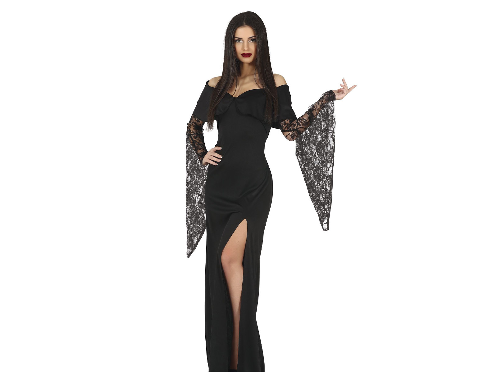 Teljes felszerelés: hosszú, fekete ruha kivágott ujjakkal.