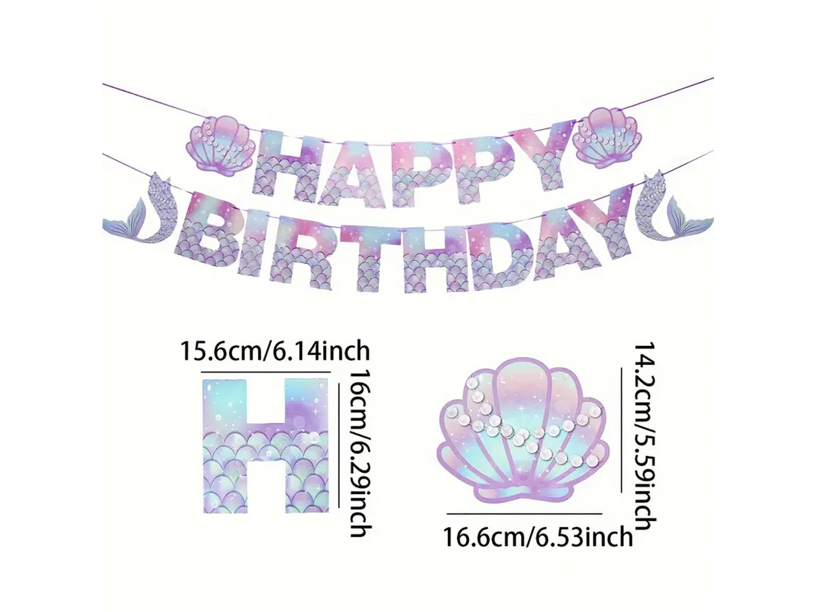 • Egyoldalas papír banner kagylókkal és a Happy Birthday üzenettel sellő motívummal.
