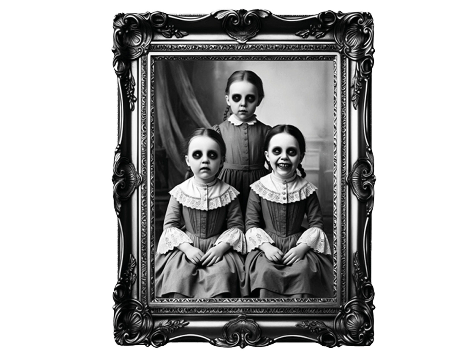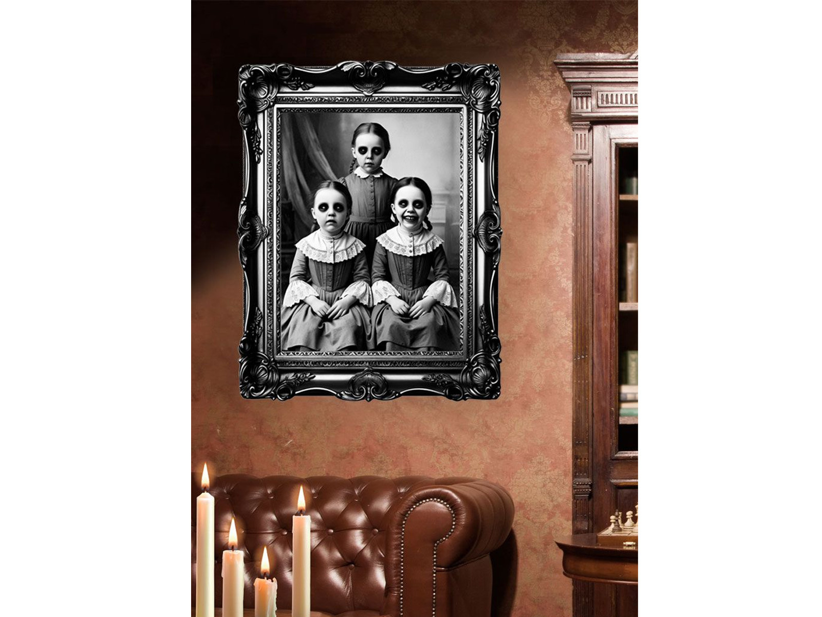 • Fekete-fehér festmény ijesztő kísértetjárta gyerekekkel dekoratív keretben.