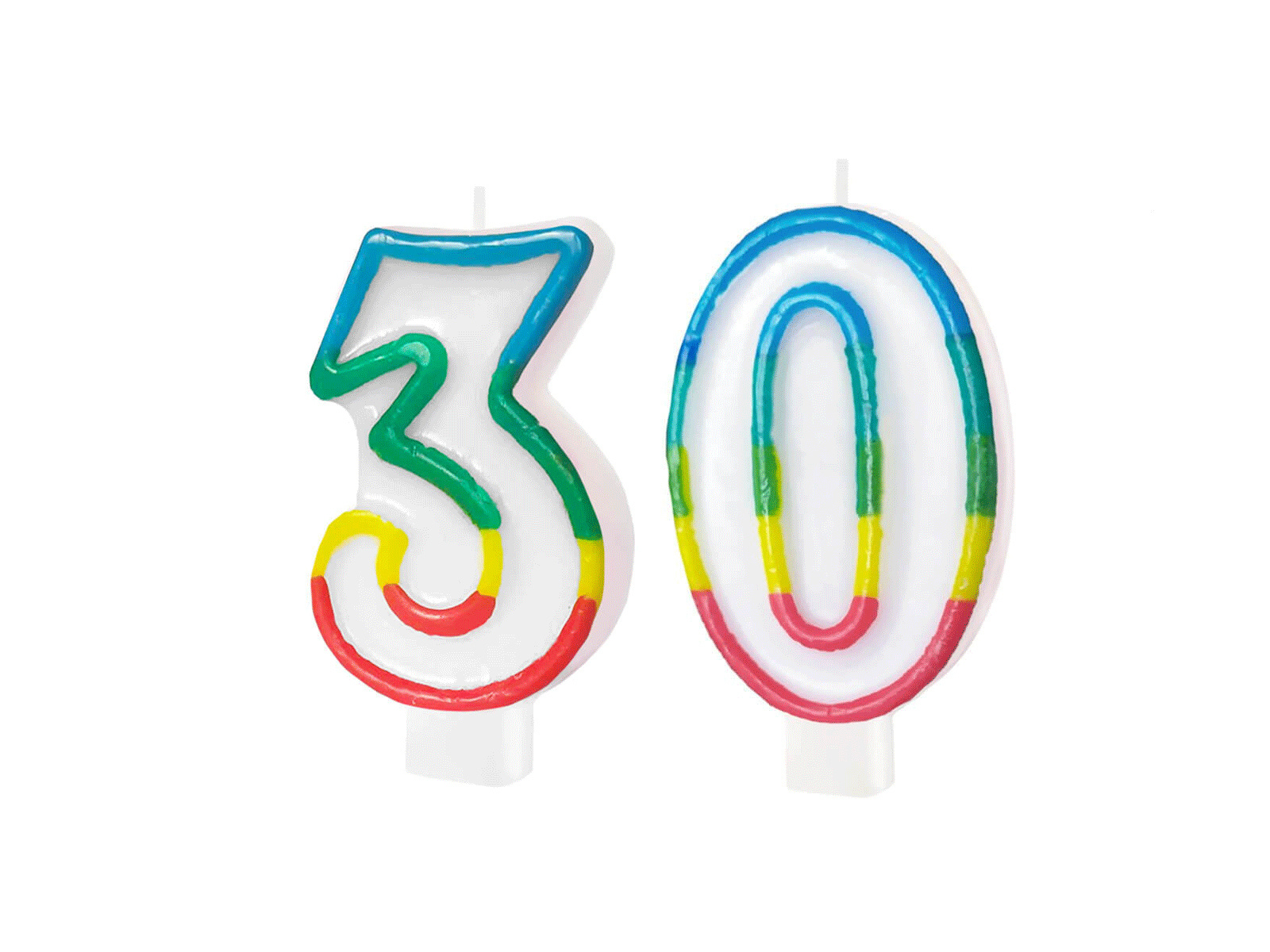 Számgyertyák színes szegéllyel 30-as számmal - 8,5 cm - 2 db.