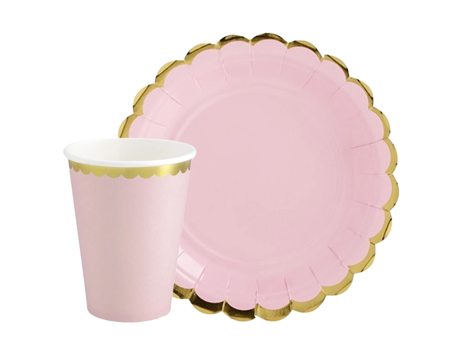 Készlet csészékből + papírtányérokból rózsaszín arany színben - 24 db.