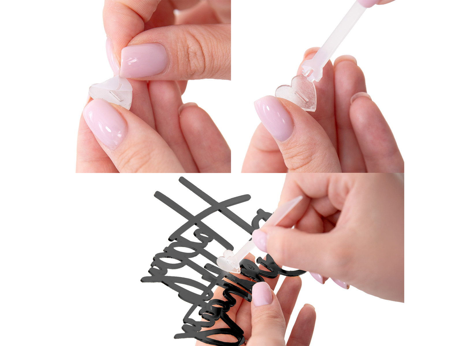 A készlet tartalmazza: 1 x topper, 1 x szedő, 1 x akrilszív a topper és a szedő összekapcsolásához.