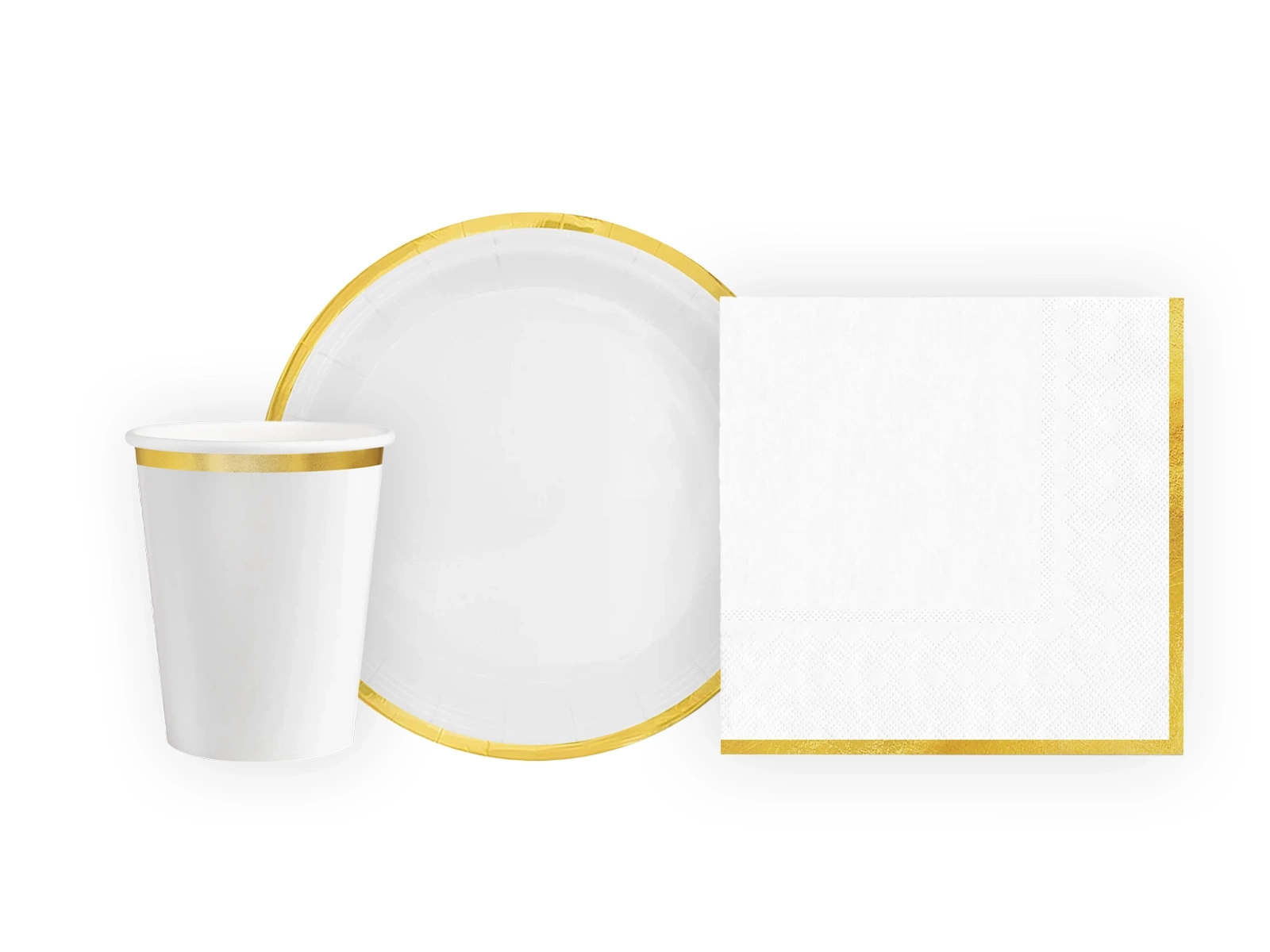 Csészék + szalvéták + papírtányérok fehér, arany peremmel - 22 db.