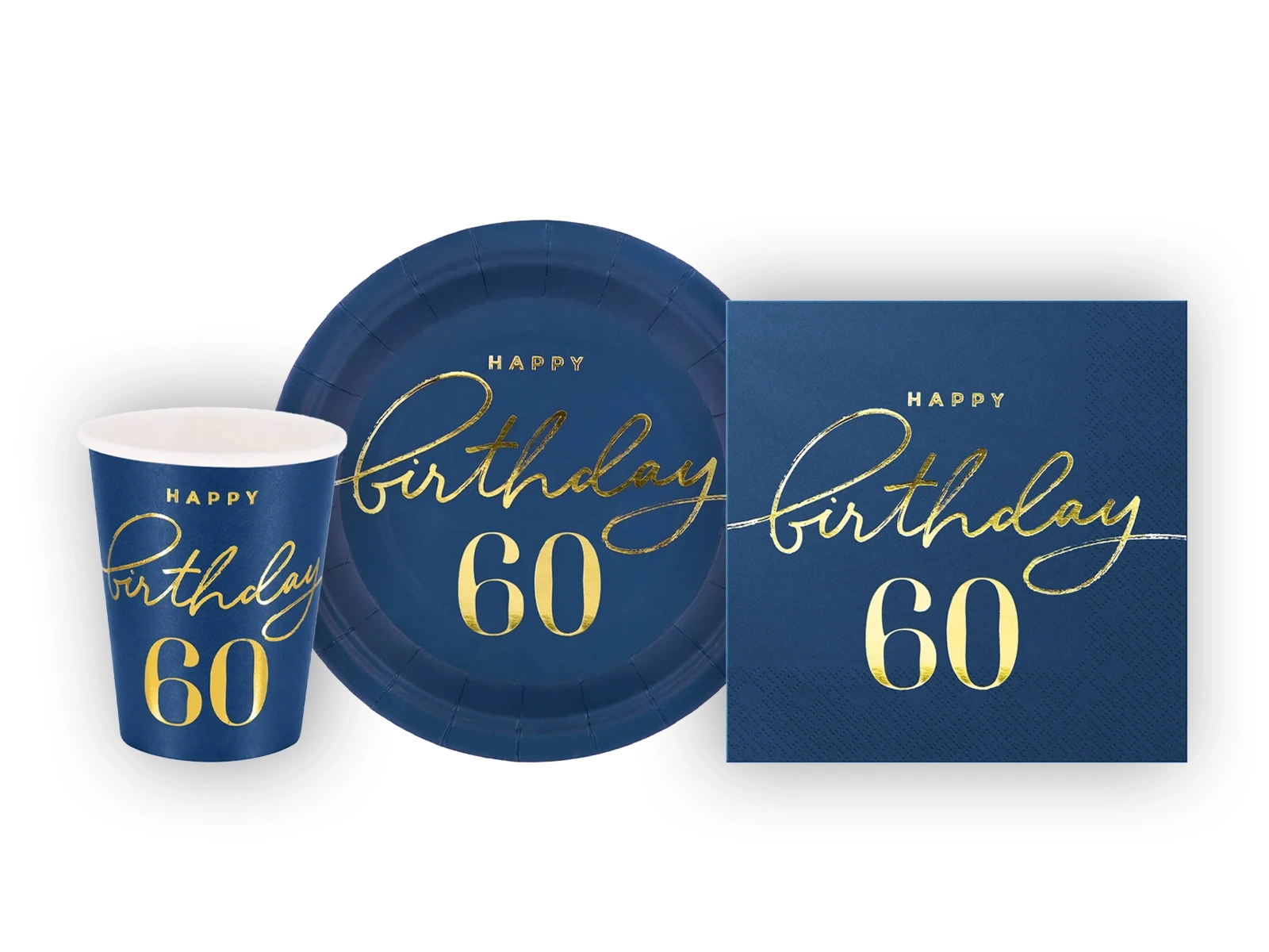 Csészék + szalvéták + papírtányérok készlet 60. születésnapra - 22 db.