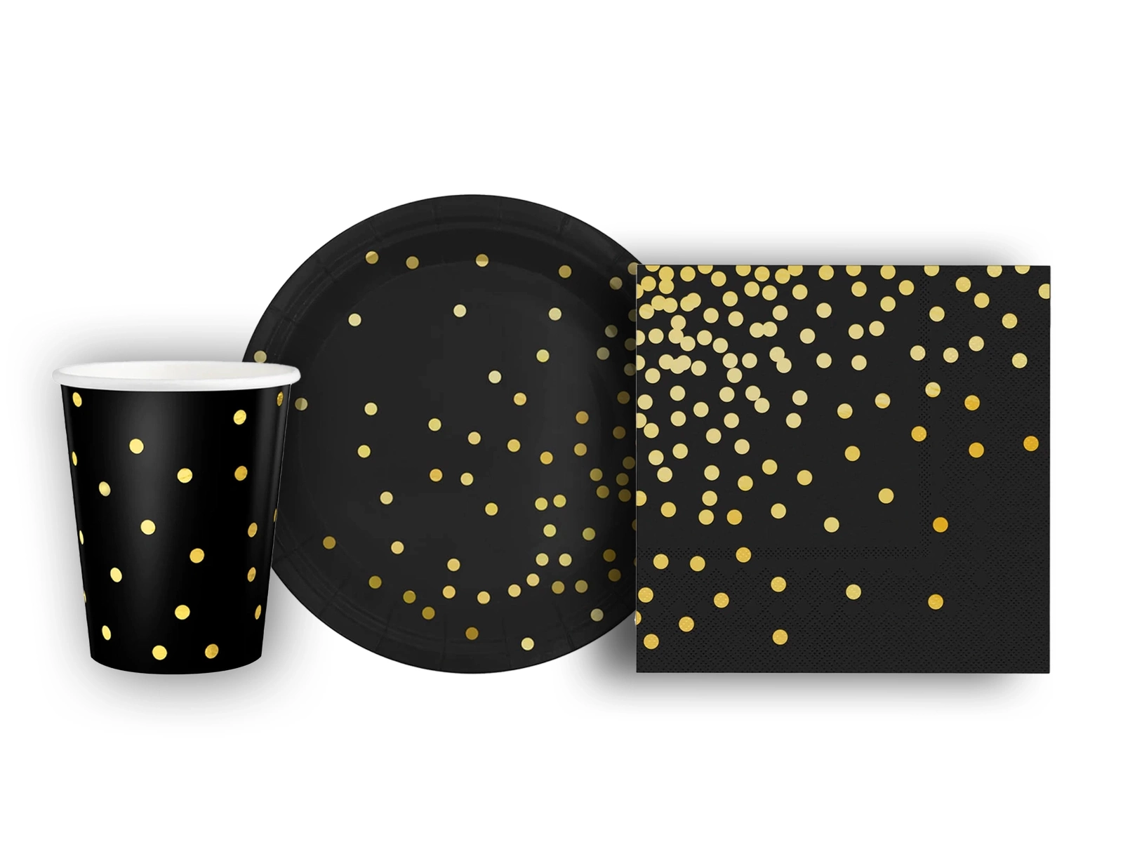 Csészék + szalvéták + papírtányérok fekete arany pöttyökkel - 22 db.
