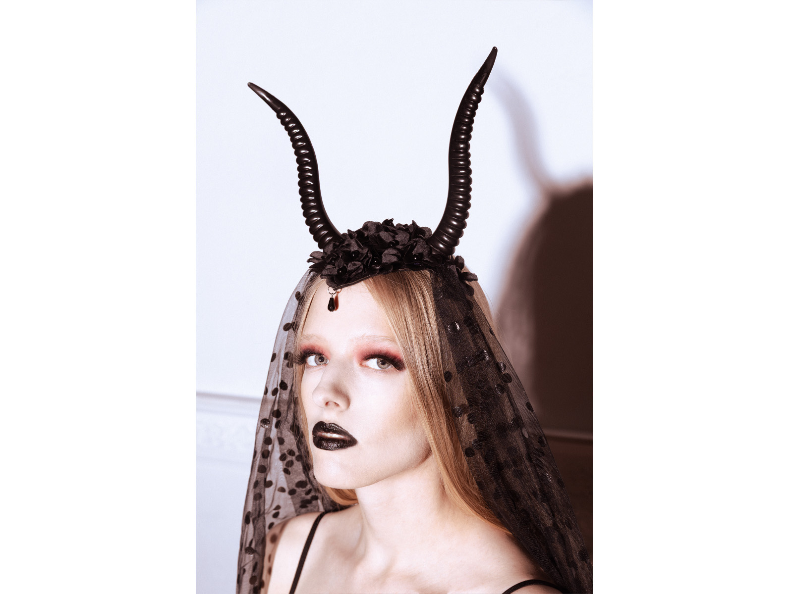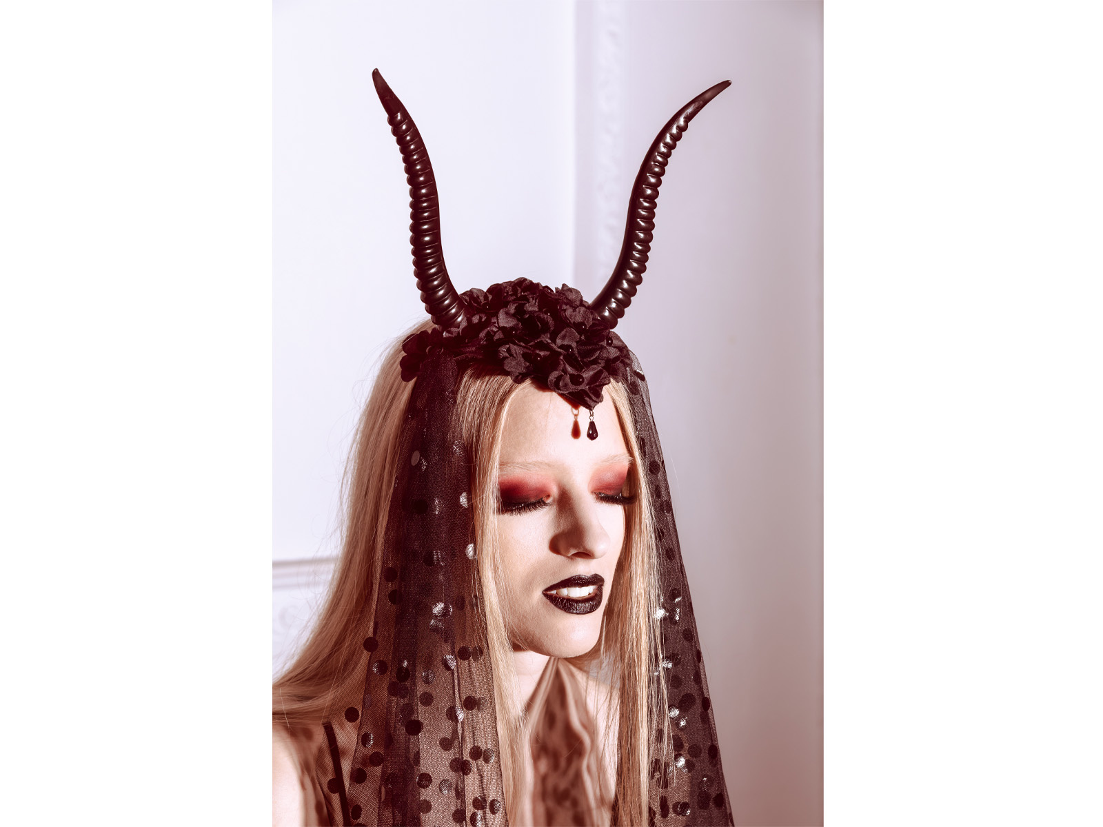 • Fejpánt fekete ördögszarvakkal és fekete tüllel.