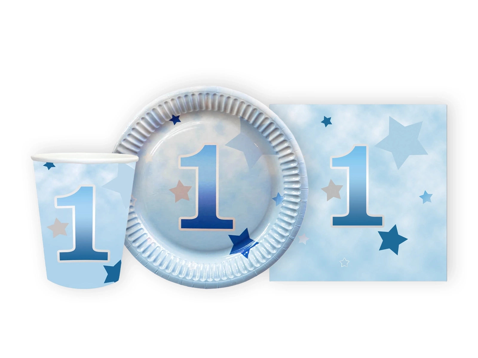 Csészék + szalvéták + papírtányérok készlet a születésnapi partira Csillagok kék - 44 db.