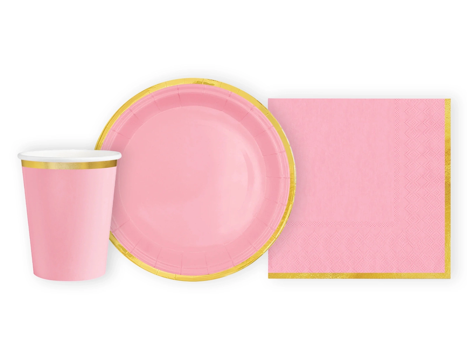Csészék + szalvéták + papírtányérok világos rózsaszín arany peremmel - 22 db.