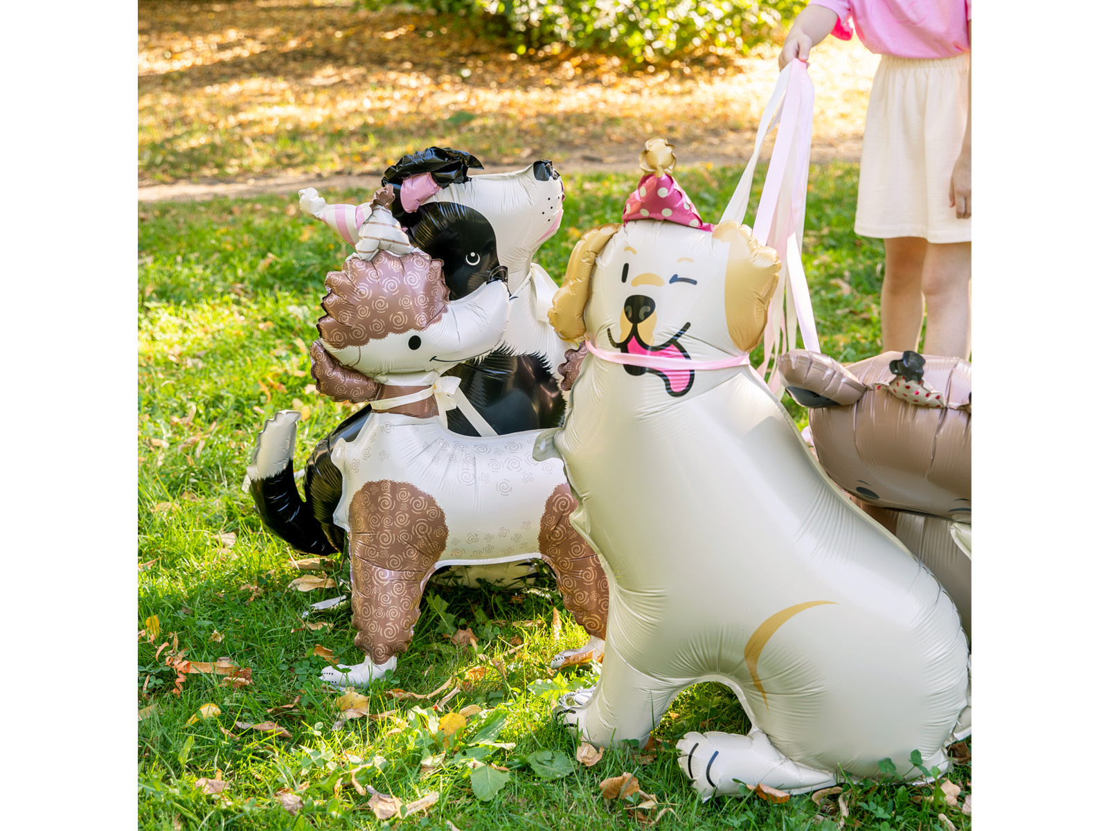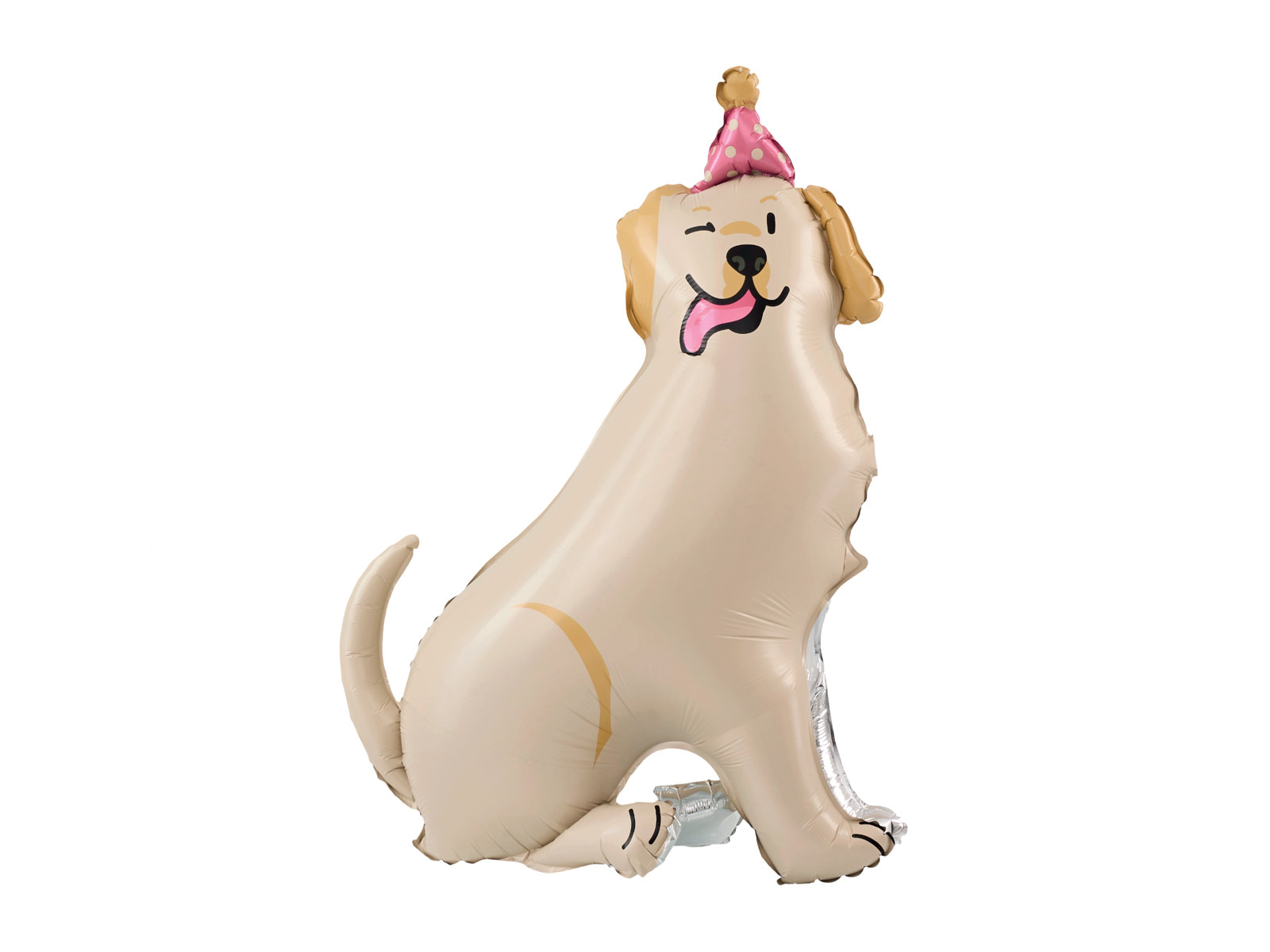 • Fólia lufi áll egy arany kutya alakjában, születésnapi sapkával.