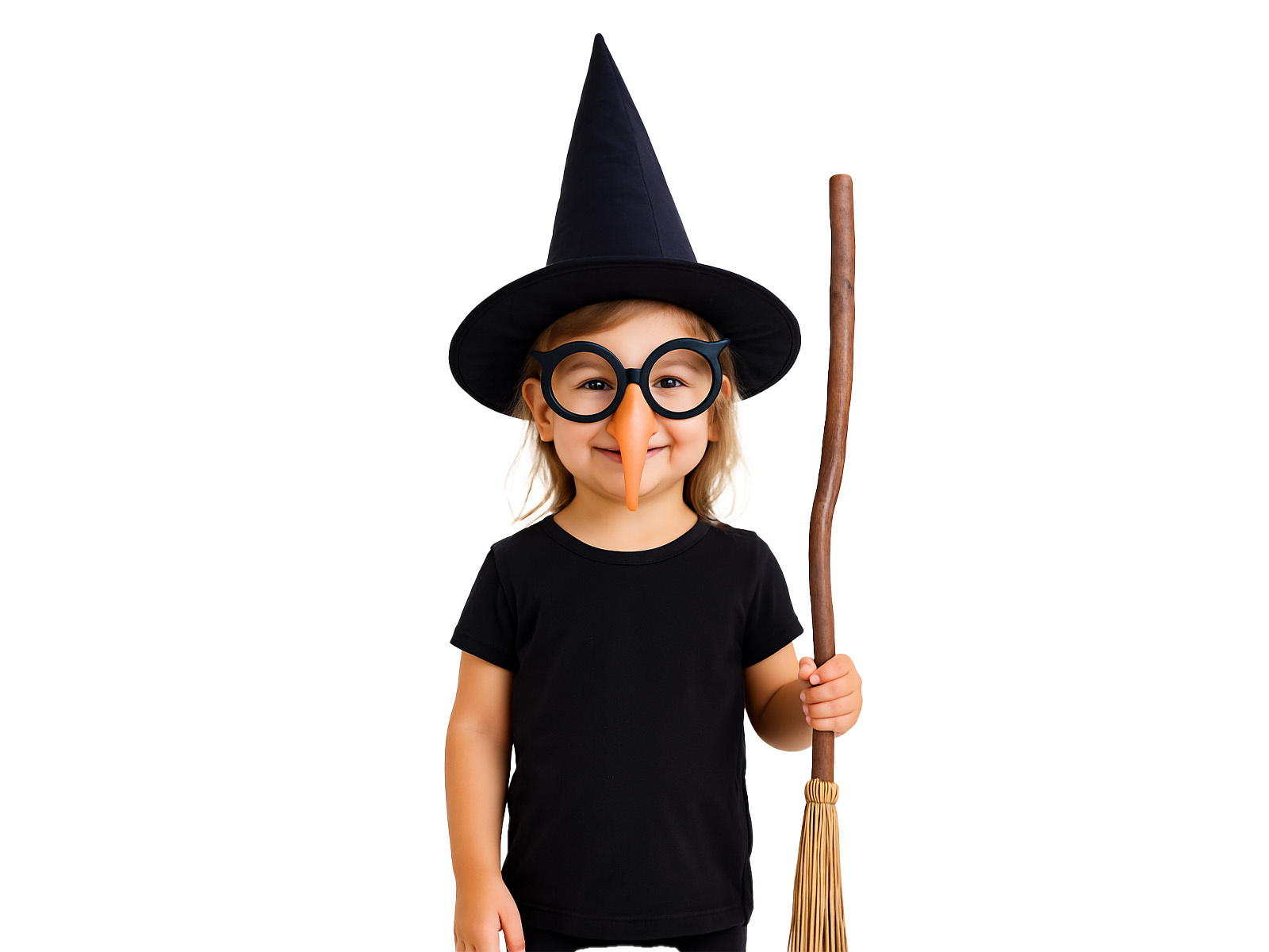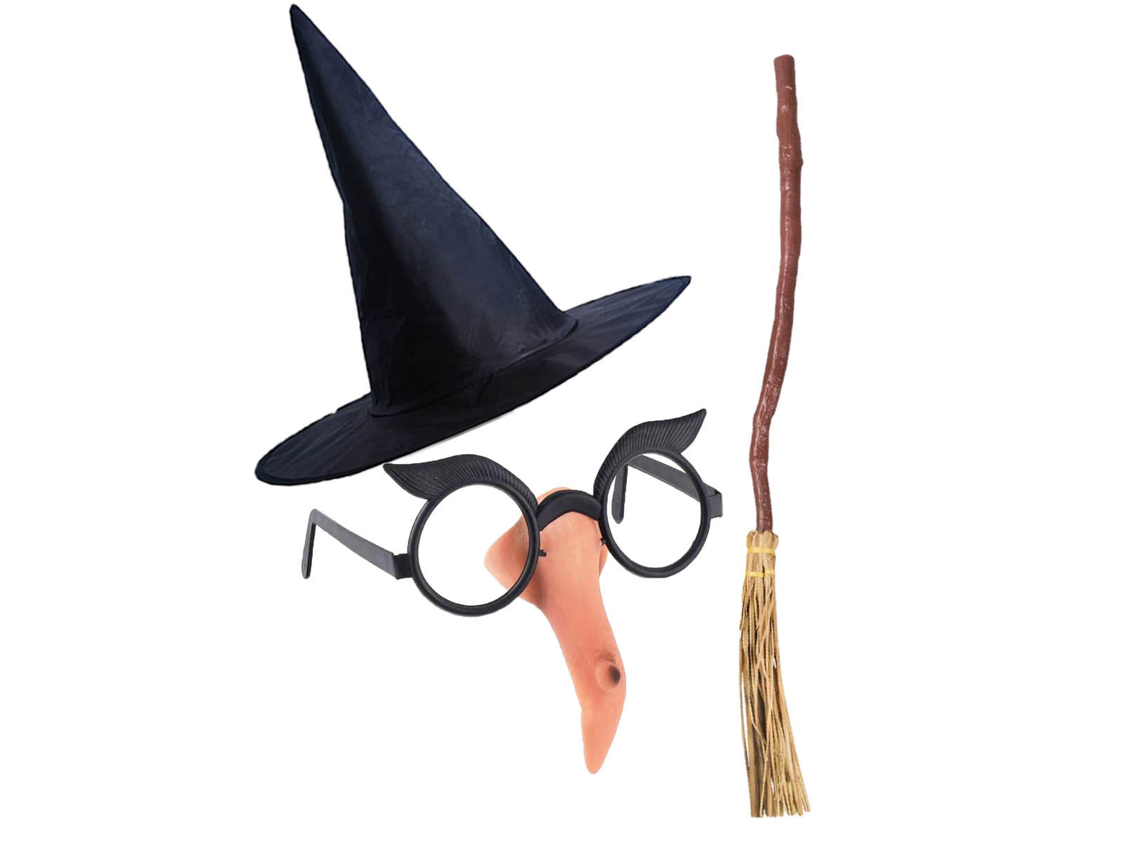 • Tartalmazza: fekete kalap (fejnyílás átmérője 19 cm, karima átmérője 38 cm, magassága 35 cm).) szemüveg orral, seprűnyéllel (90 cm).