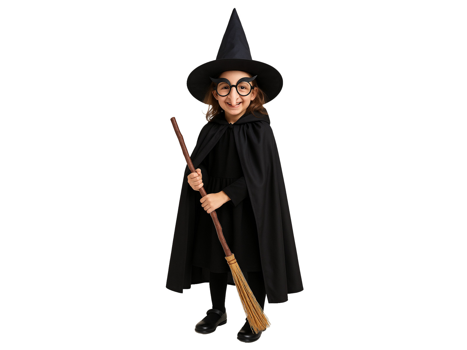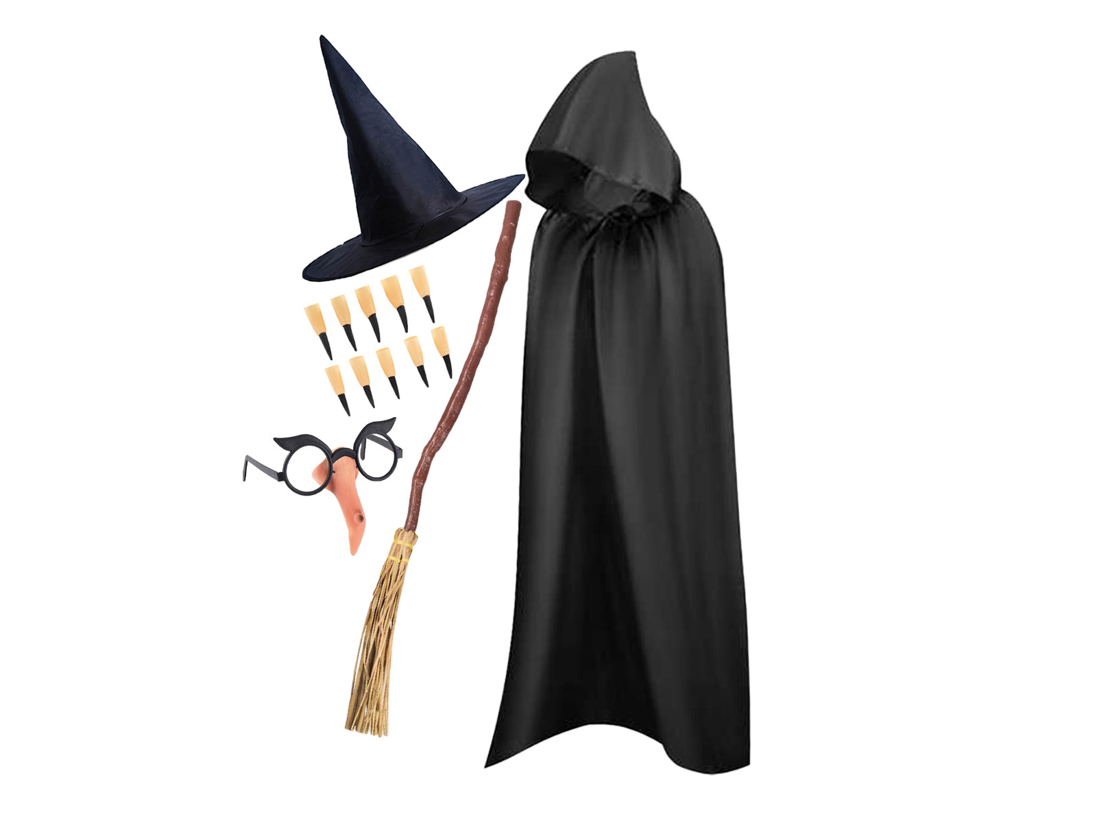 Komplett: fekete köpeny (hossza: 135 cm).), kalap (fejnyílás átmérője 19 cm, karima átmérője 38 cm, magassága 35 cm), seprűnyél (90 cm), boszorkánykarmok (10 db) és szemüveg orral.