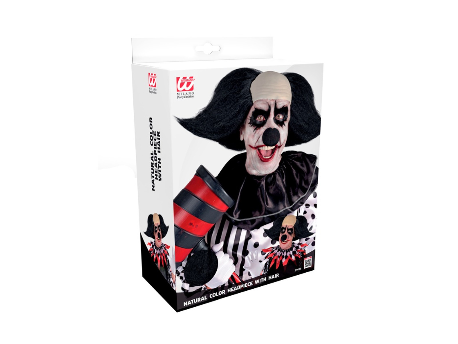 • Baljós bohóc fejdísz fekete hajjal egy dobozban férfiak számára.