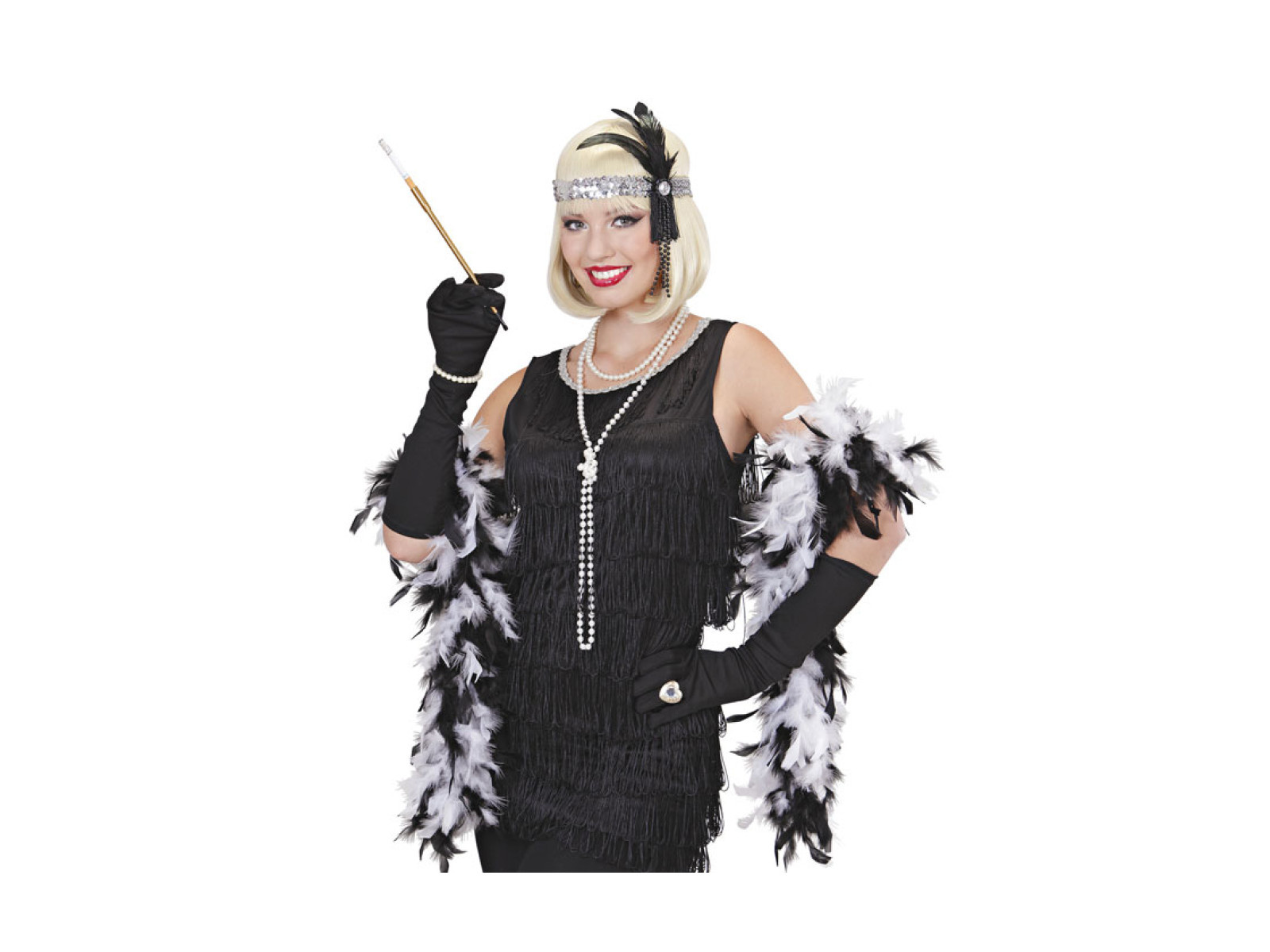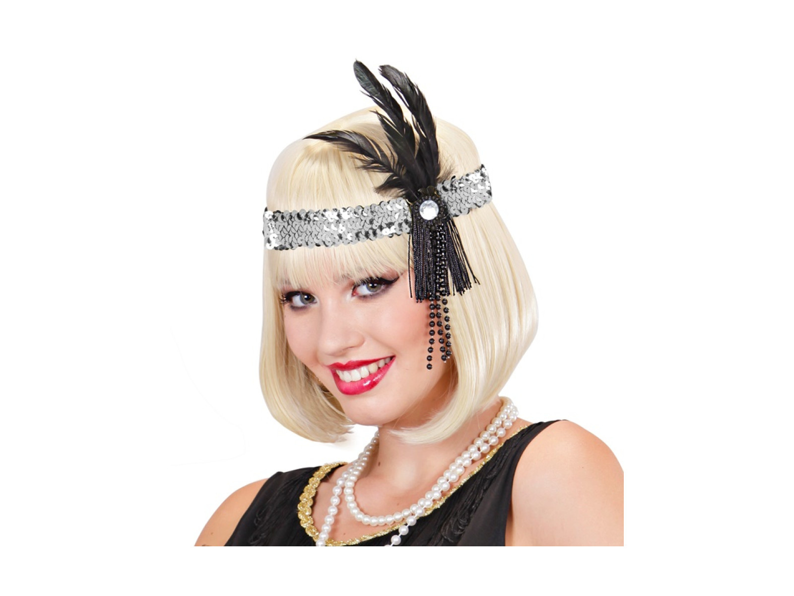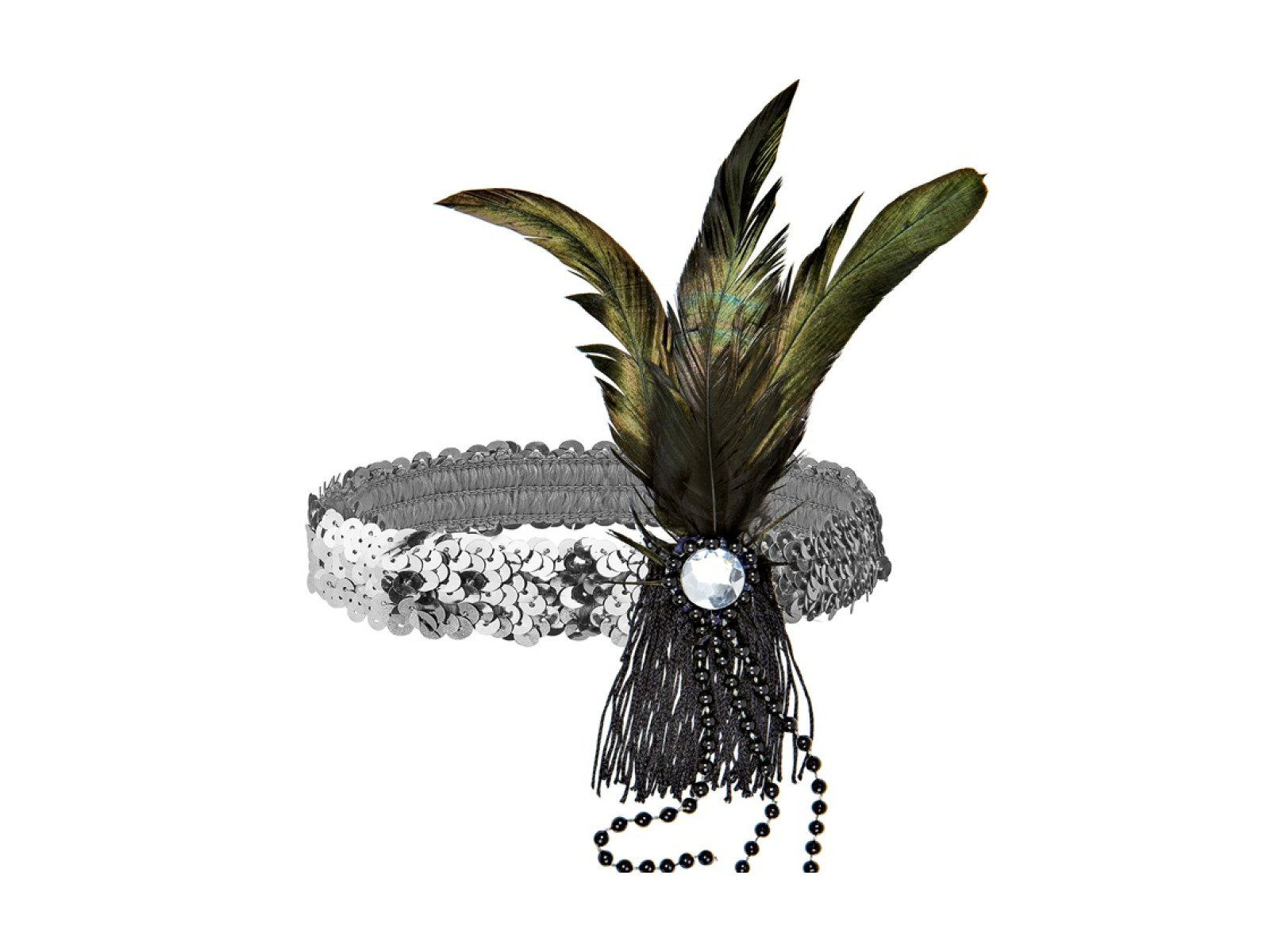 Ezüst flitteres fejpánt tollal és gyöngyökkel