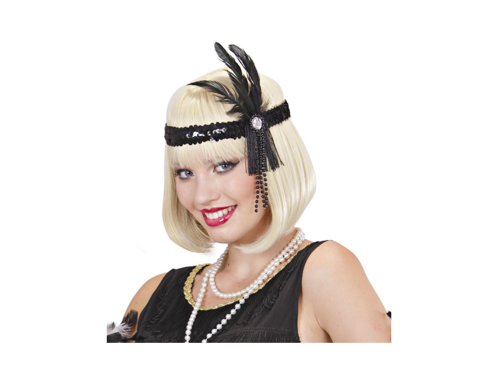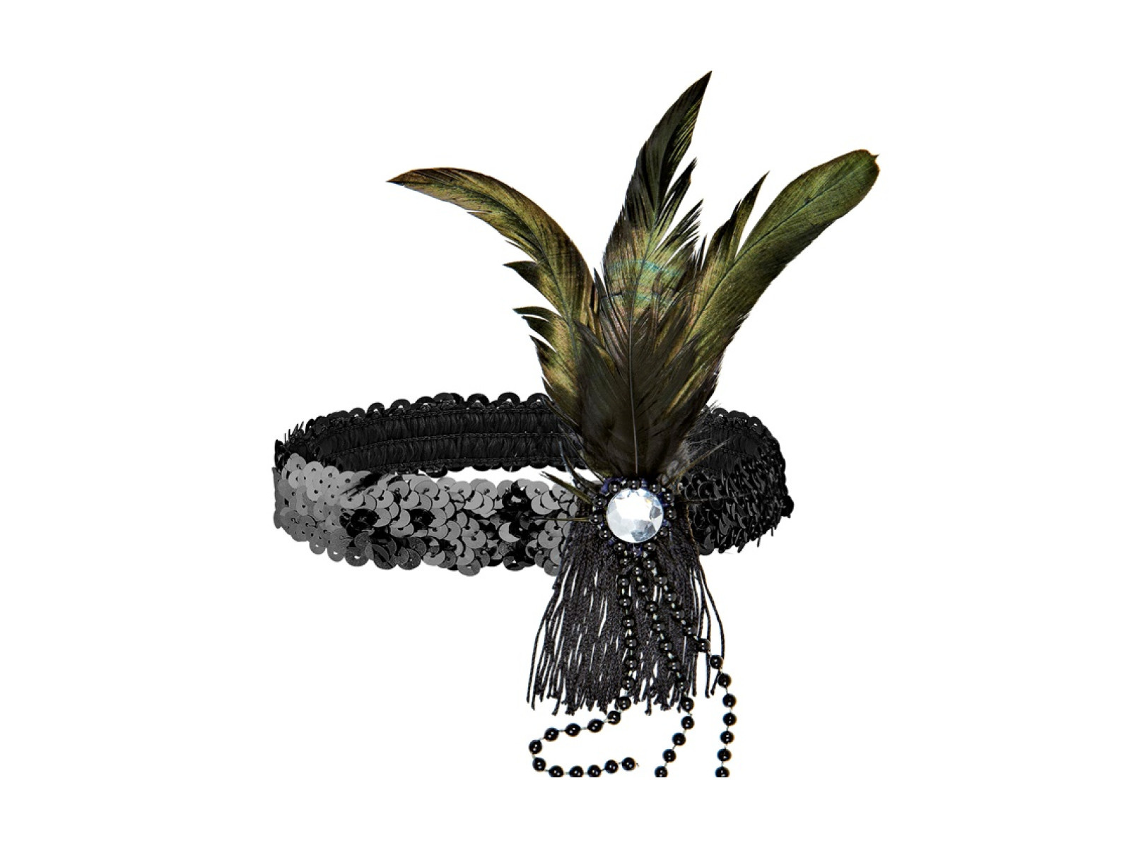 Fekete flitteres fejpánt tollal és gyöngyökkel