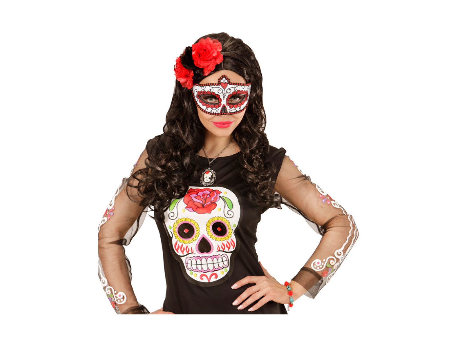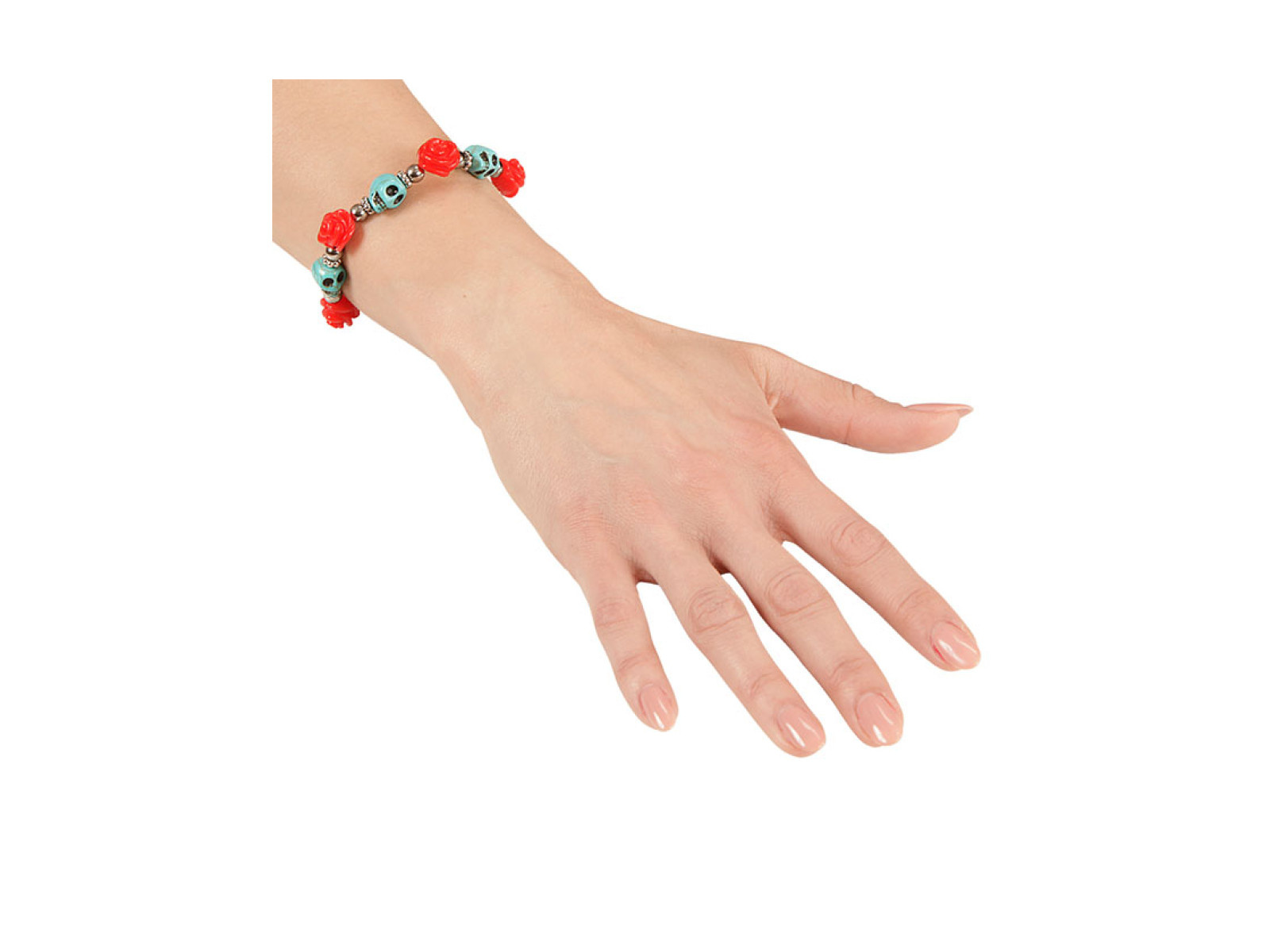 Türkiz karkötő koponyákkal és vörös rózsákkal